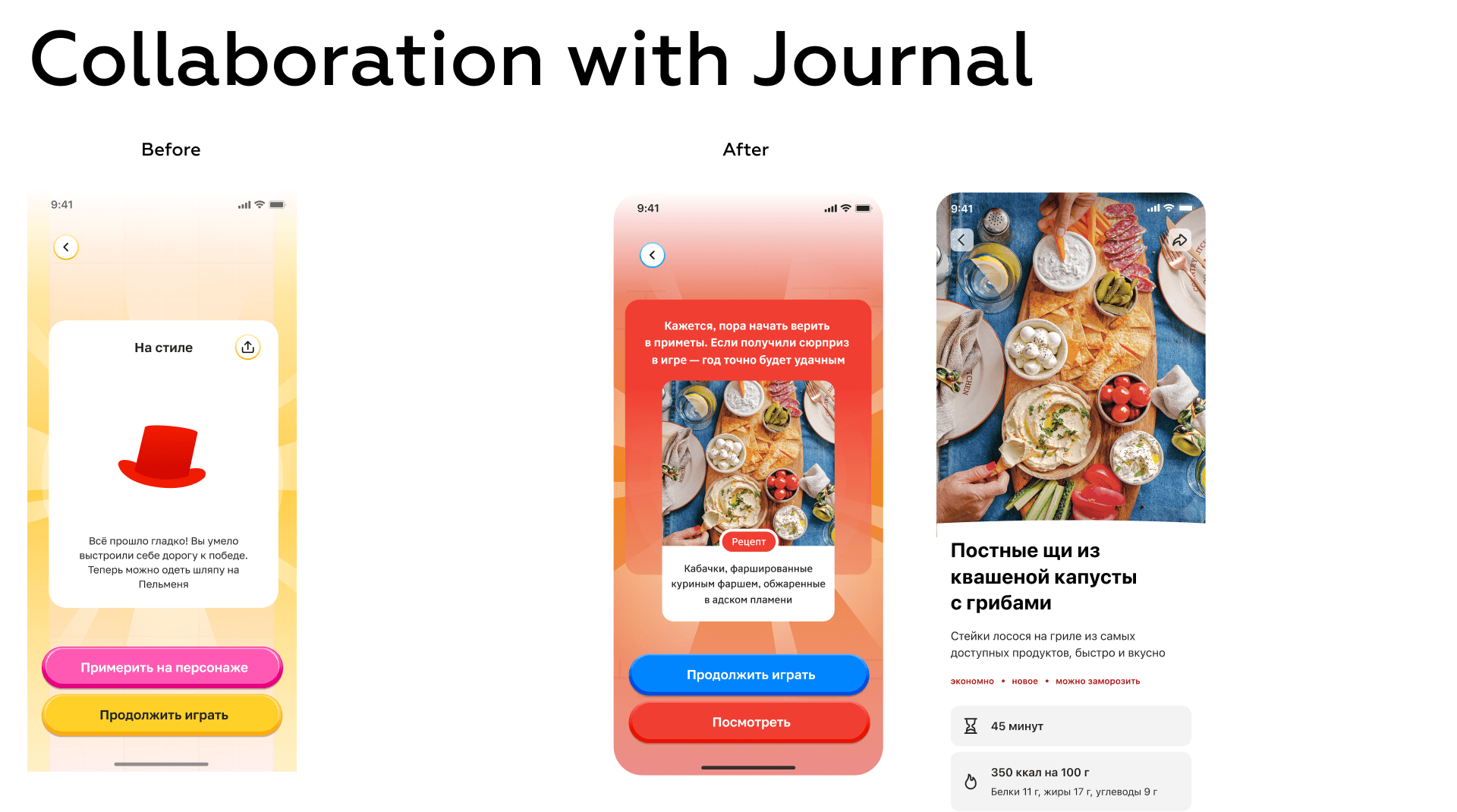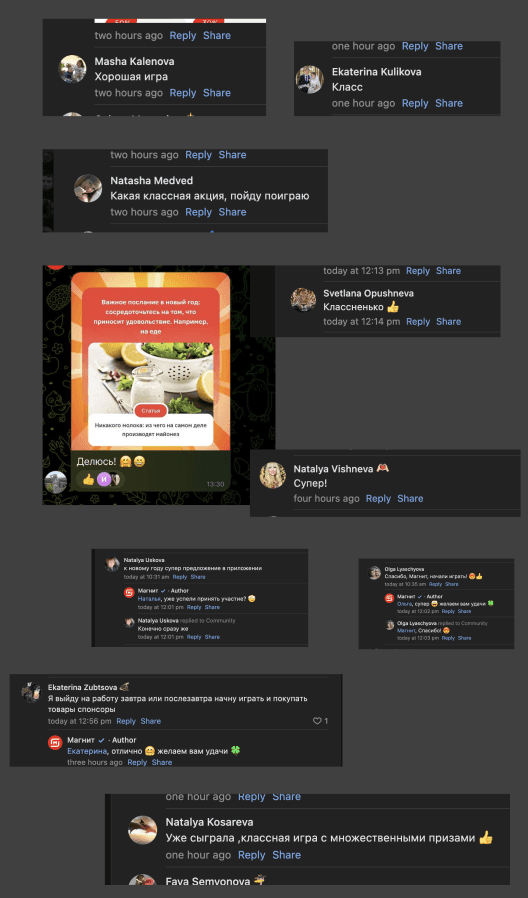 In the end, we managed to increase traffic to the magazine by 20%. This signifies that we successfully engaged users with new types of achievements and promoted another content product for Magnit. Since our audiences did not overlap, this integration not only helped them gain new users but also benefited us, as the magazine featured compilations with New Year recipes with an entry point to the game.