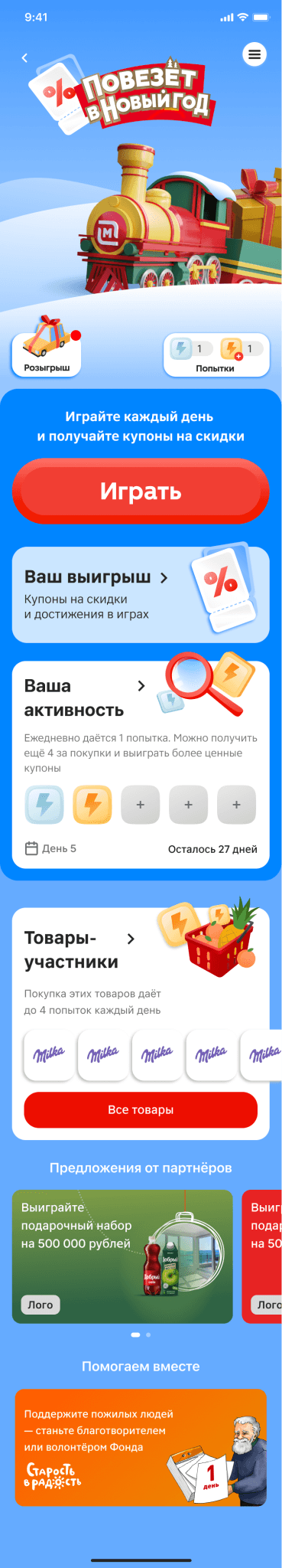 Additionally, it became clear from the research that the visual representation of attempts confused users. Our task was to clearly communicate that free and paid attempts differed. To obtain an attempt, users needed to make a purchase of at least 500 rubles or buy participating promotion items. Initially, the communication designer had the idea to visually show the difference between paid attempts (separate visuals for a receipt attempt and a coupon attempt), but users found this confusing. Therefore, the visual representation of attempts also changed in the new version.