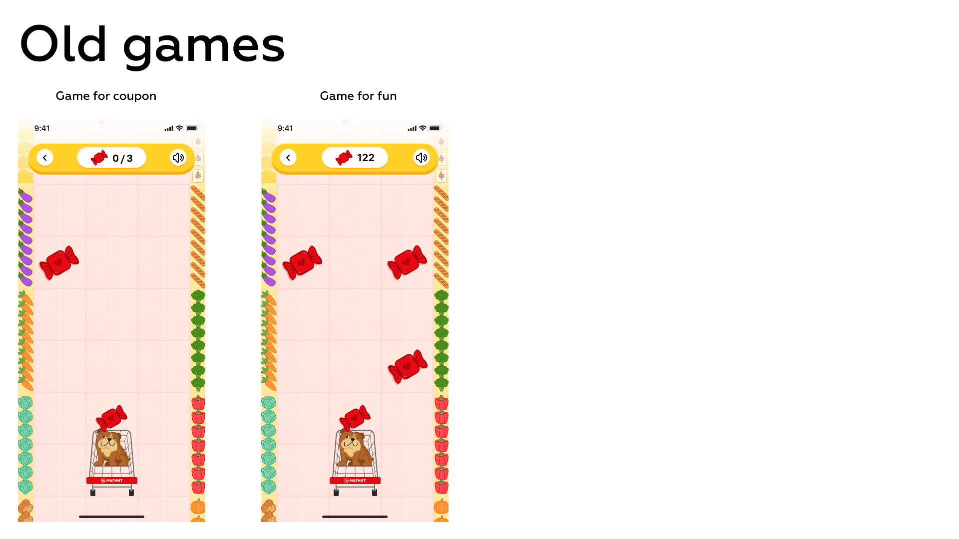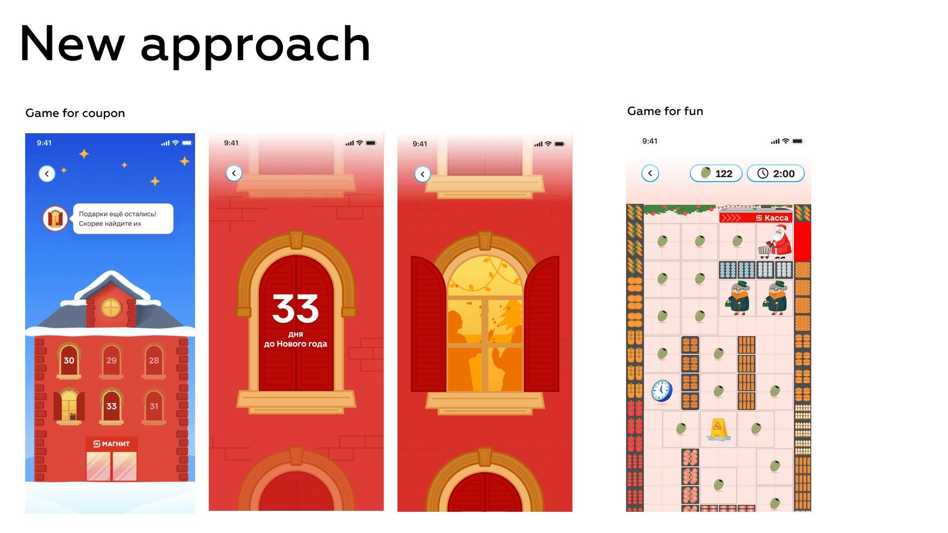 For the New Year's game, we suggested to simplifying the coupon game. As a mechanic, we chose an advent calendar, where users simply open a window and receive a prize. The fan game, on the other hand, resembles the mechanics of Pac-Man. Users need to collect New Year's food items for the festive table.