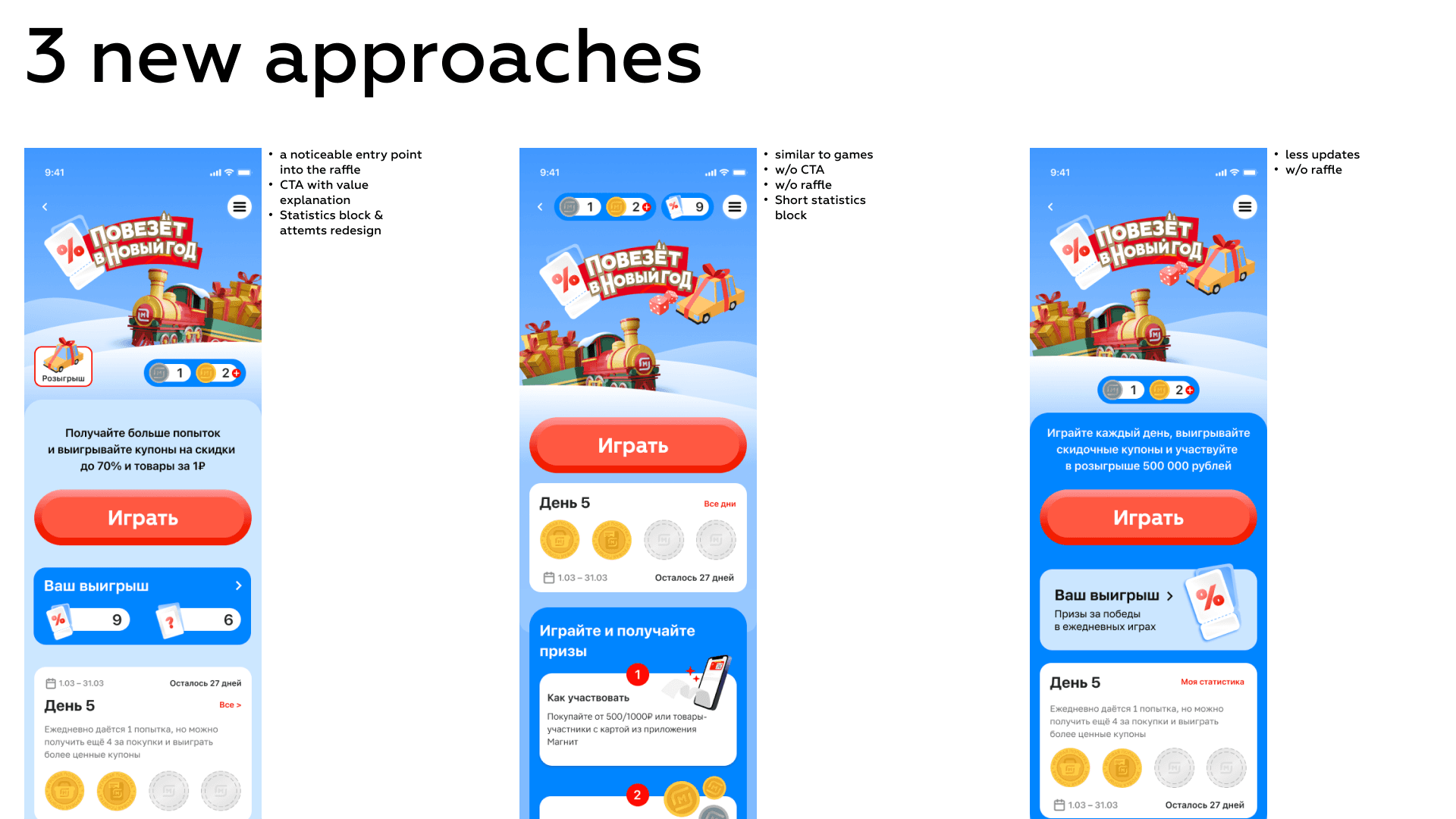 To validate hypotheses through qualitative research, I prepared three new approaches for the main campaign page. The designs introduced a menu, a giveaway entry point, a gamified block with attempts, and the ability to track progress by day.