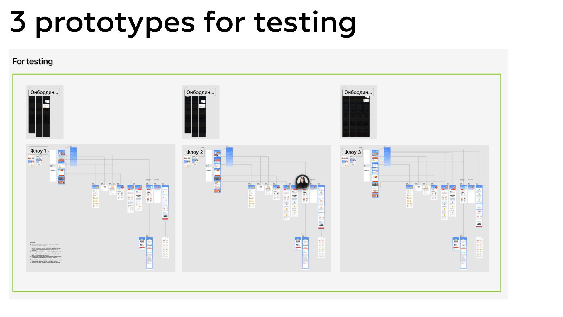 Сonducted qualitative research, collaboratively designed the study, and prepared questions and hypotheses for each new flow separately. Interviewed 9 respondents, divided them into 3 groups, showing each group 1 of the 3 prototype variants.