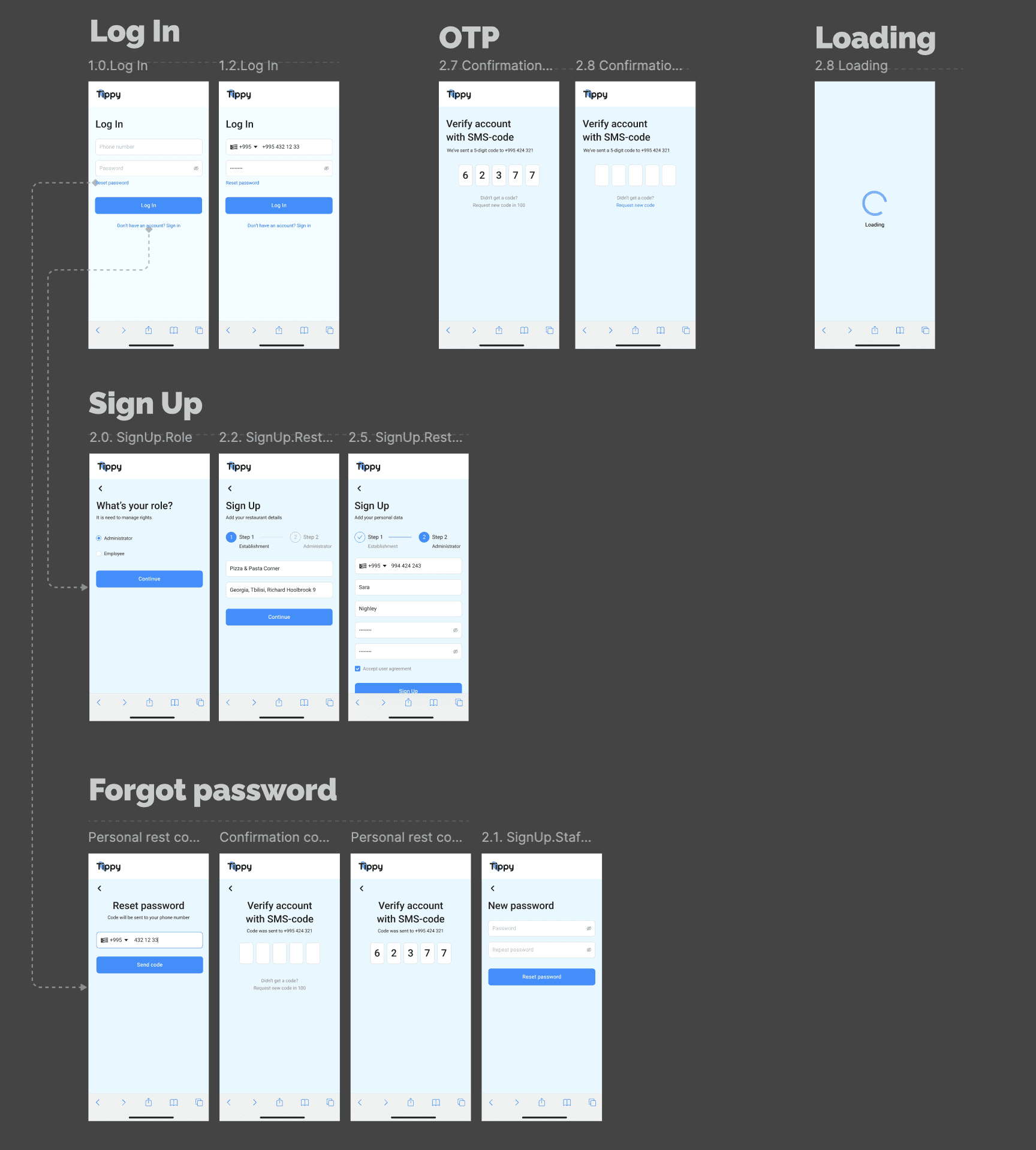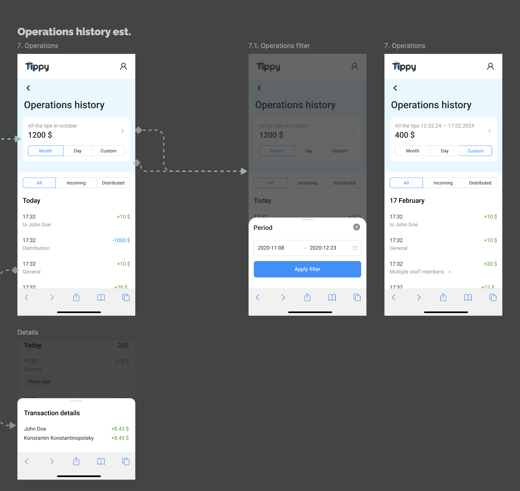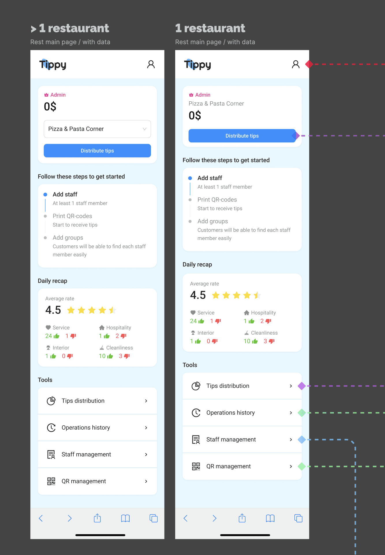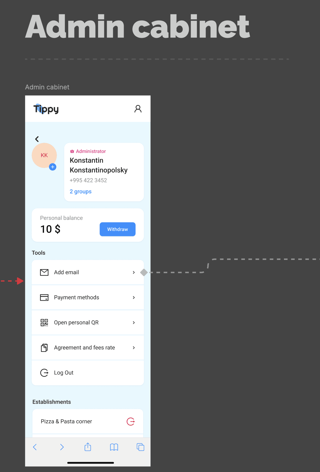 Tippy — is a contactless tipping service for the Arabic market. The service consists of a web application for clients, where users can leave tips, as well as admin panels for managers and owners, where they can add employees, distribute funds between them, and view establishment statistics.