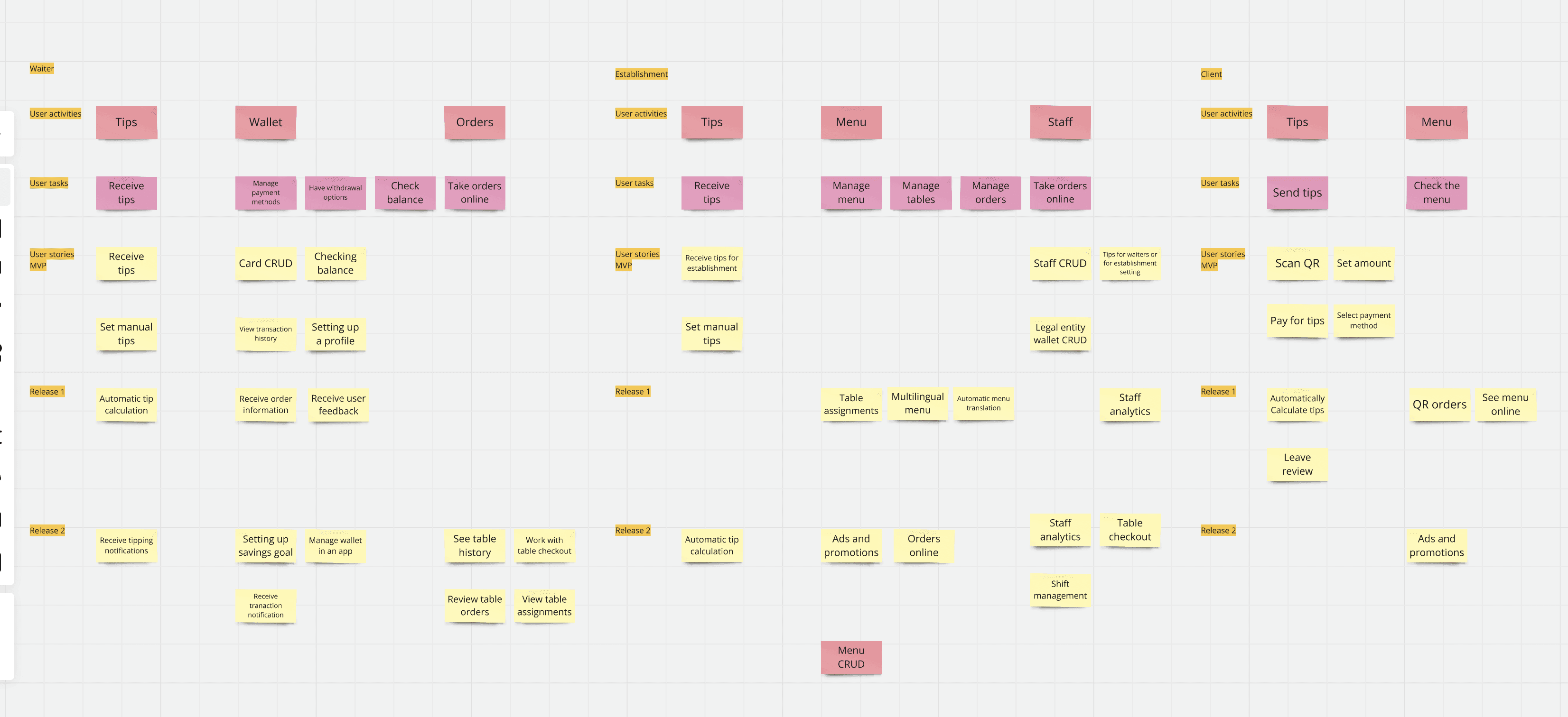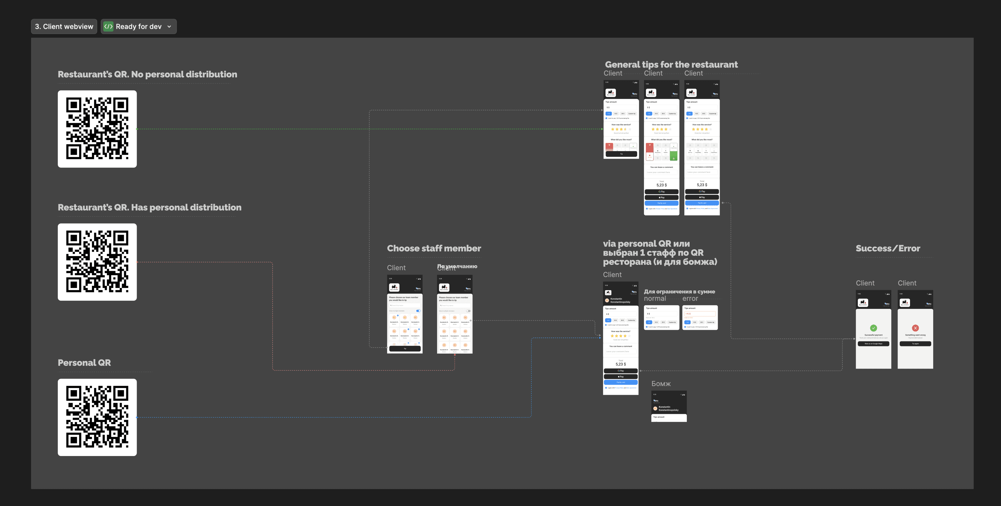 In the MVP version, the client application turned out to be simple, where there is an option to choose the tip amount, the ability to leave a rating for the establishment, and select a payment method.
