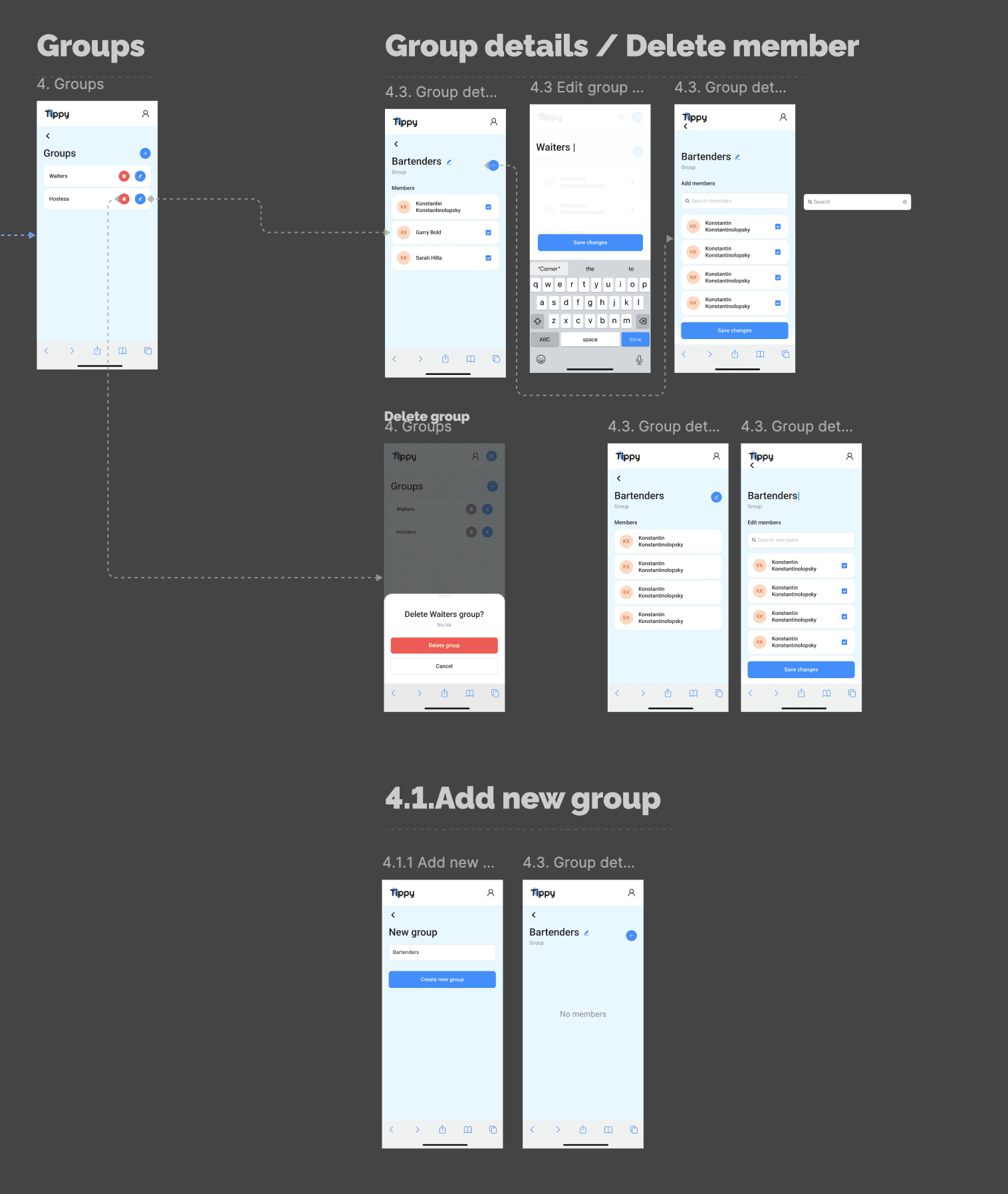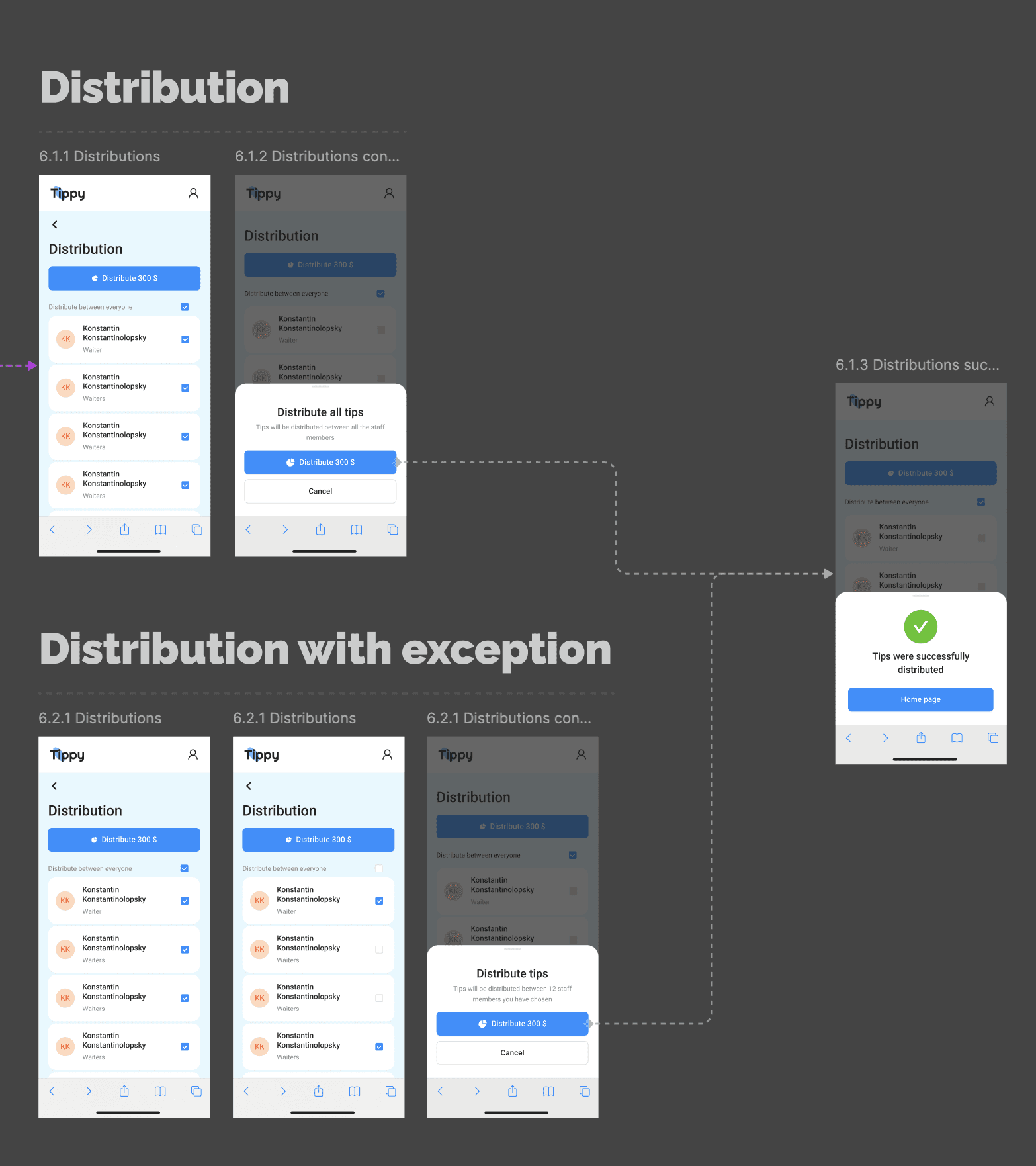 I created a simple tip distribution flow — in the MVP, we provide the ability to distribute only among employees for now, but later there will be an option to distribute immediately to groups. Here you can choose to distribute among all employees or mark specific ones.